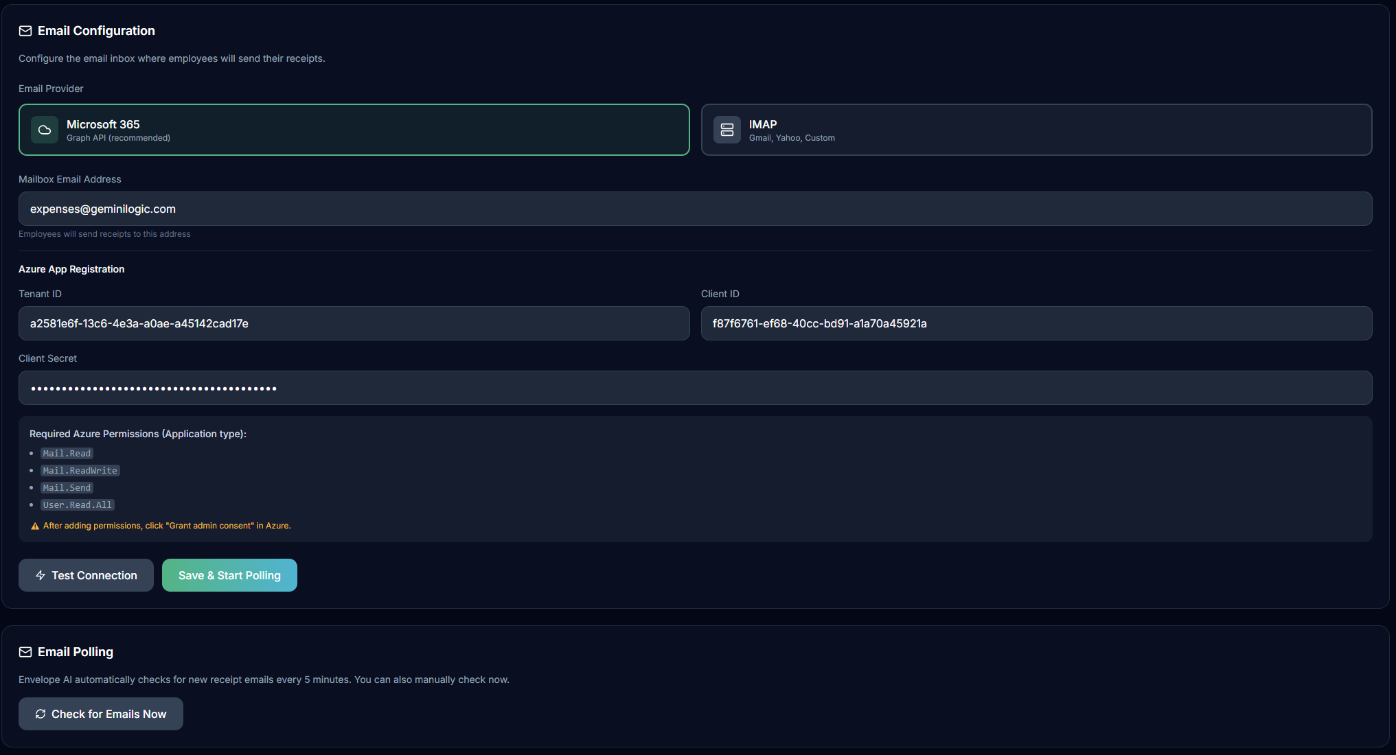 Envelope AI for Spire is a Gemini Logic tool that captures receipts from email (Microsoft 365 / IMAP) or manual upload, extracts the details with OCR + AI, and helps your team review and post clean expense entries into Spire ERP—with approvals, coding, and audit-ready attachments.