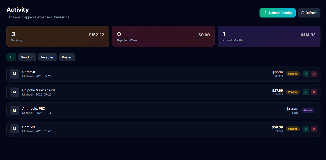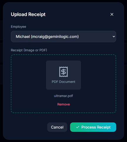For receipts that don’t come through email, users can upload PDFs or images directly. Envelope AI extracts the details and prepares the entry for review—no special training required.