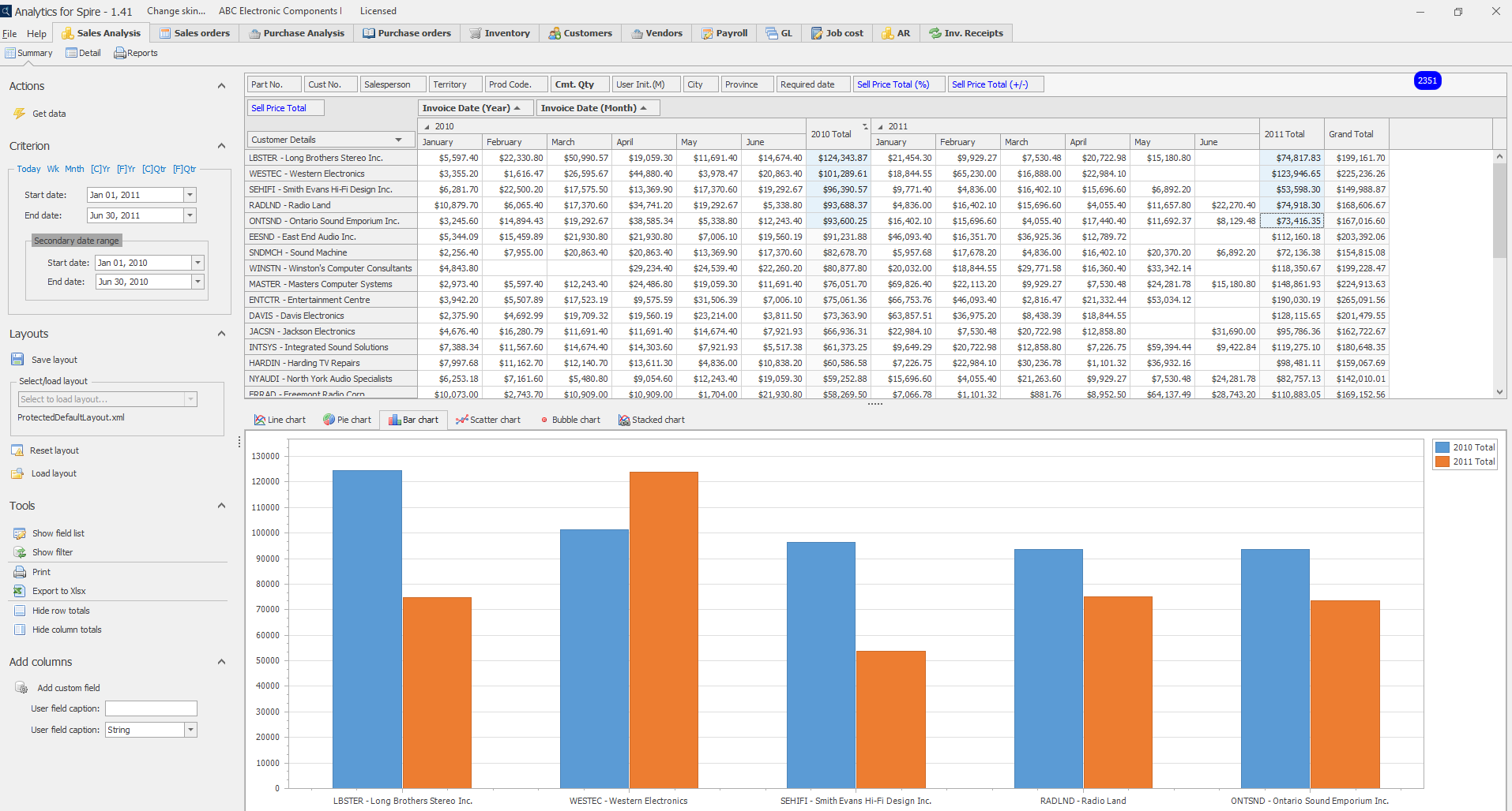 How to create Spire Commission Reports 1) Group, Filter and Total by Salesperson 2) Use Fixed or Variable Commission Rates to Calculate Commissions How to create Spire Sales Reports (14:10) 1) Report by Month, Quarter, Year etc. 2) Report by Sales, Costs, Gross Profit, GP%, Units Sold etc. 3) Graphical Analysis